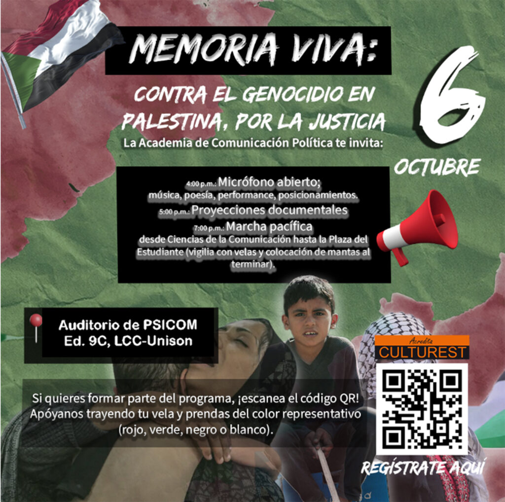 Actividades por el segundo aniversario del genocidio israelí en Palestina. Licenciatura en Ciencias de la Comunicación, Universidad de Sonora.